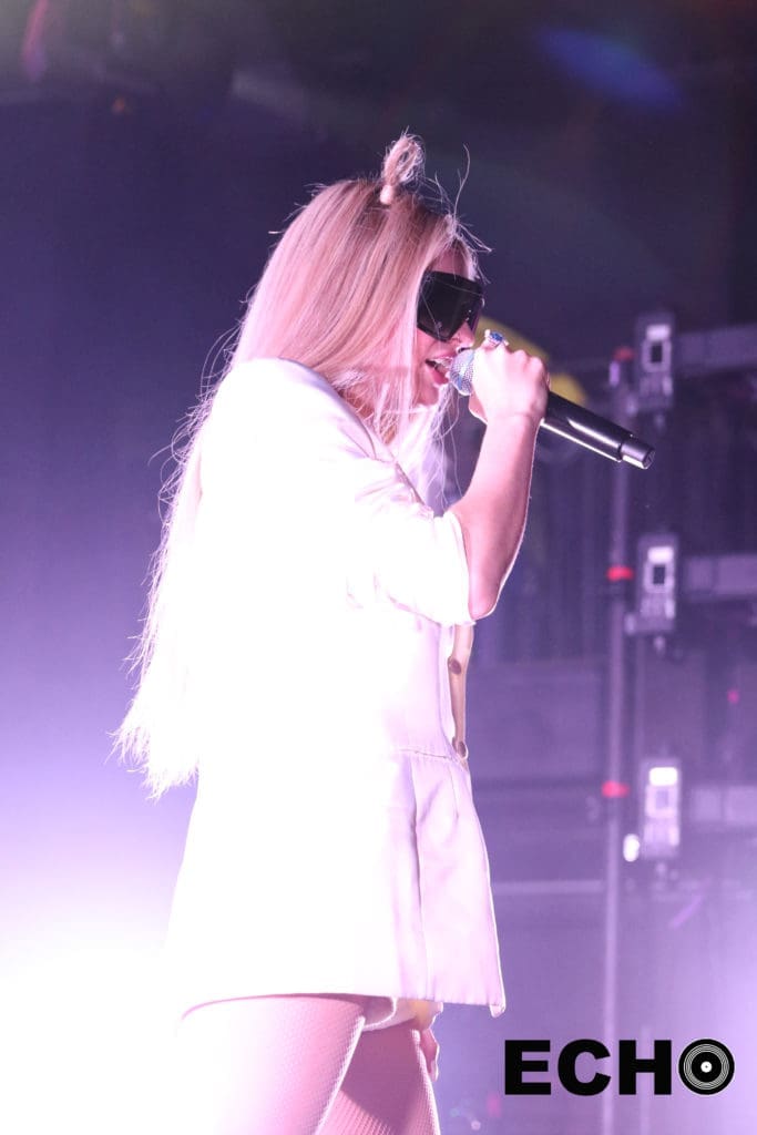 A robotic voice echoed through the venue demanding a “Woo-Ah!” call and response from the spectators. Bathed in a hot pink hue, Petras stepped onto the stage in an oversized white suit jacket and black shades. The deafening screams from the crowd blended with the reverberation of her first song “Got My Number”. Throughout her three acts, Petras seamlessly introduced each number, segwayed into the next with the support of her producer and designated hype man Aaron Joseph, and quick-changed into three separate costumes.