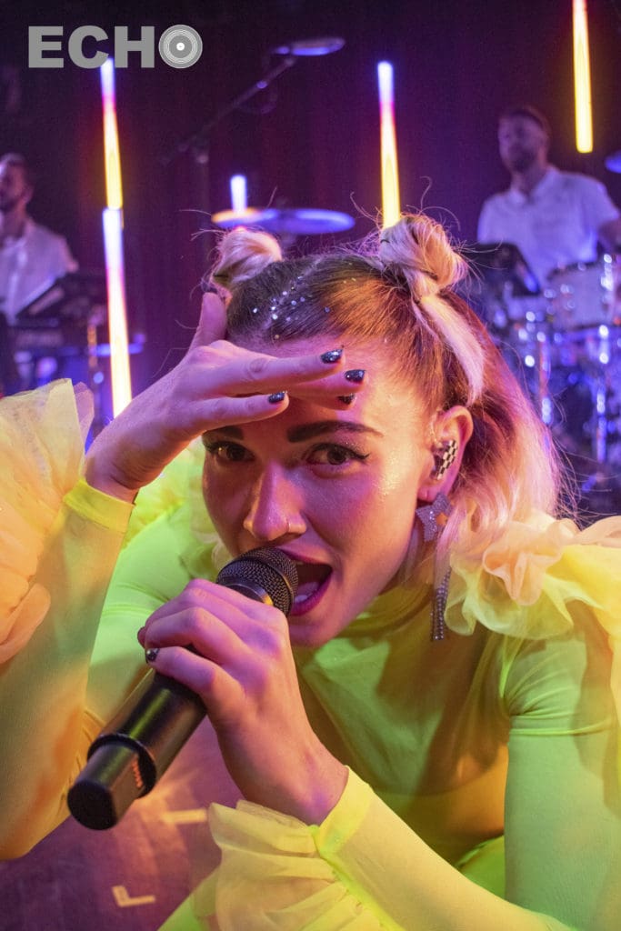 With the lights off, five of the band members took to the stage in their all-white outfits. The colorful fluorescent lights on stage began to glow just as lead Mandy Lee bounded in behind them as the first song, “The End” began.