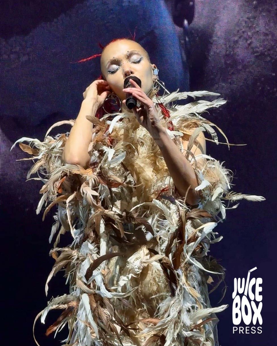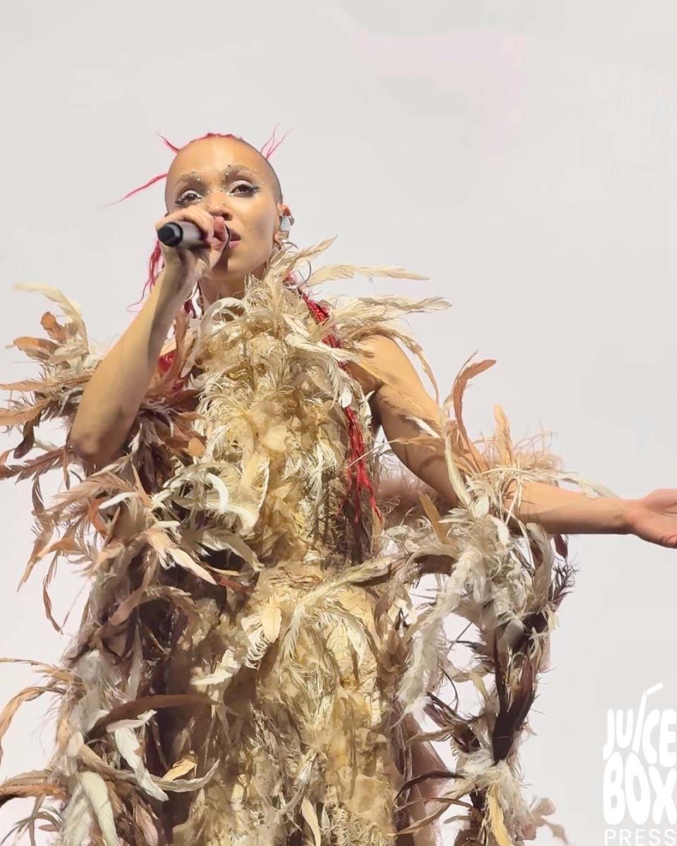 Towards the end of the set, dancers undressed to trunks and bikini briefs that blended into their complexion, and Twigs performed a series of stripped-down songs. Bodies undulated around her during “home with you”, which showcased her airy vocals and ability to convey a kind of emotion that lets so many fans in the crowd see themselves in Twigs. She later came out draped head-to-toe in brown and white feathers, lights strobing behind her to the beat of “Two Weeks”. Twigs sang with conviction, ferocity, and an open heart.